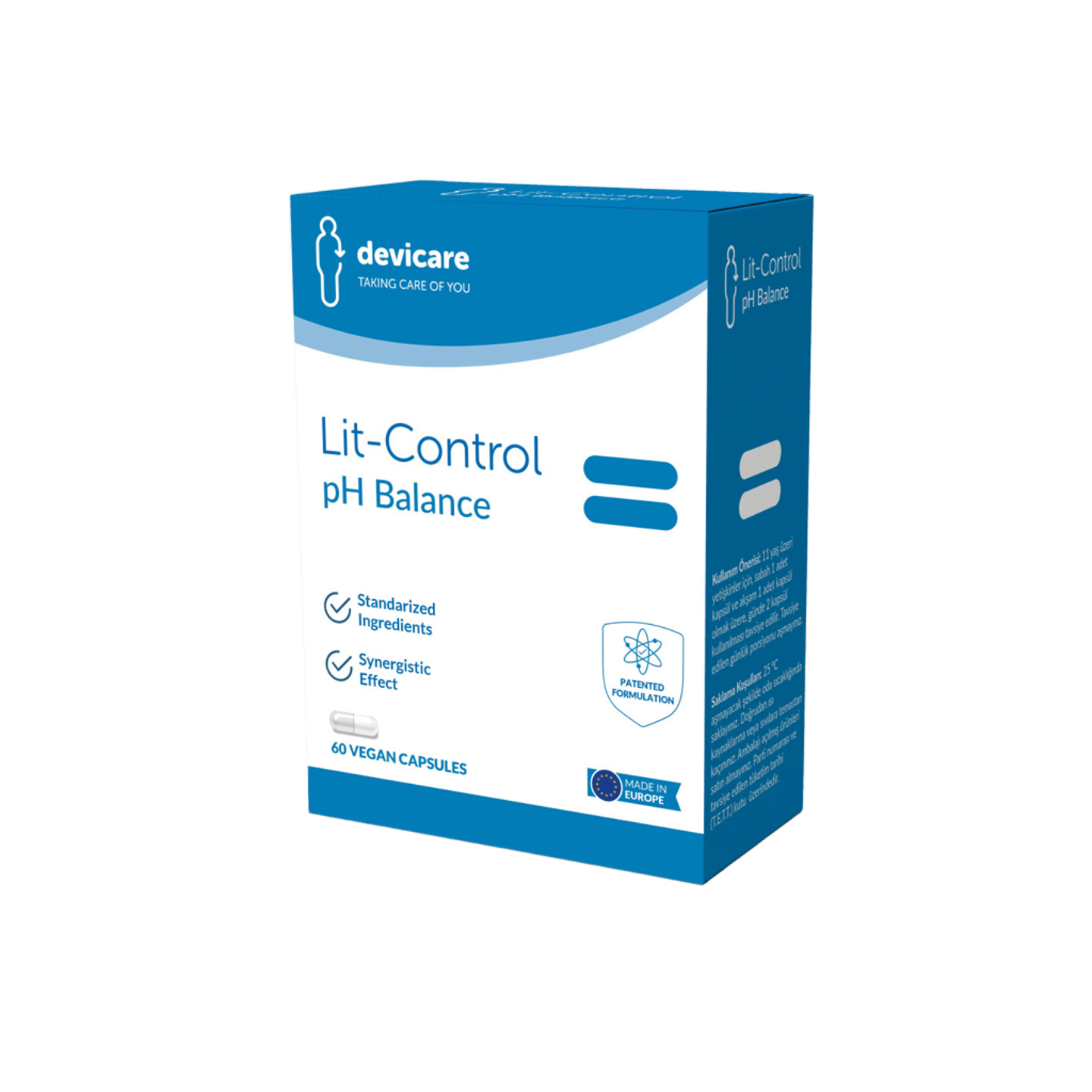 Lit-Control pH Balance допринася за нормалното функциониране на киселинно-алкалния метаболизъм на организма, като инхибира образуването на камъни в бъбреците, без да повлиява pH на урината. Фитинът предотвратява образуването и растежа на всички калциеви камъни в бъбреците. Магнезият действа в синергия с фитат, за да инхибира образуването на калциево-оксалатни камъни. Полифенолите ограничават оксидативния стрес, една от причините за образуването на камъни.